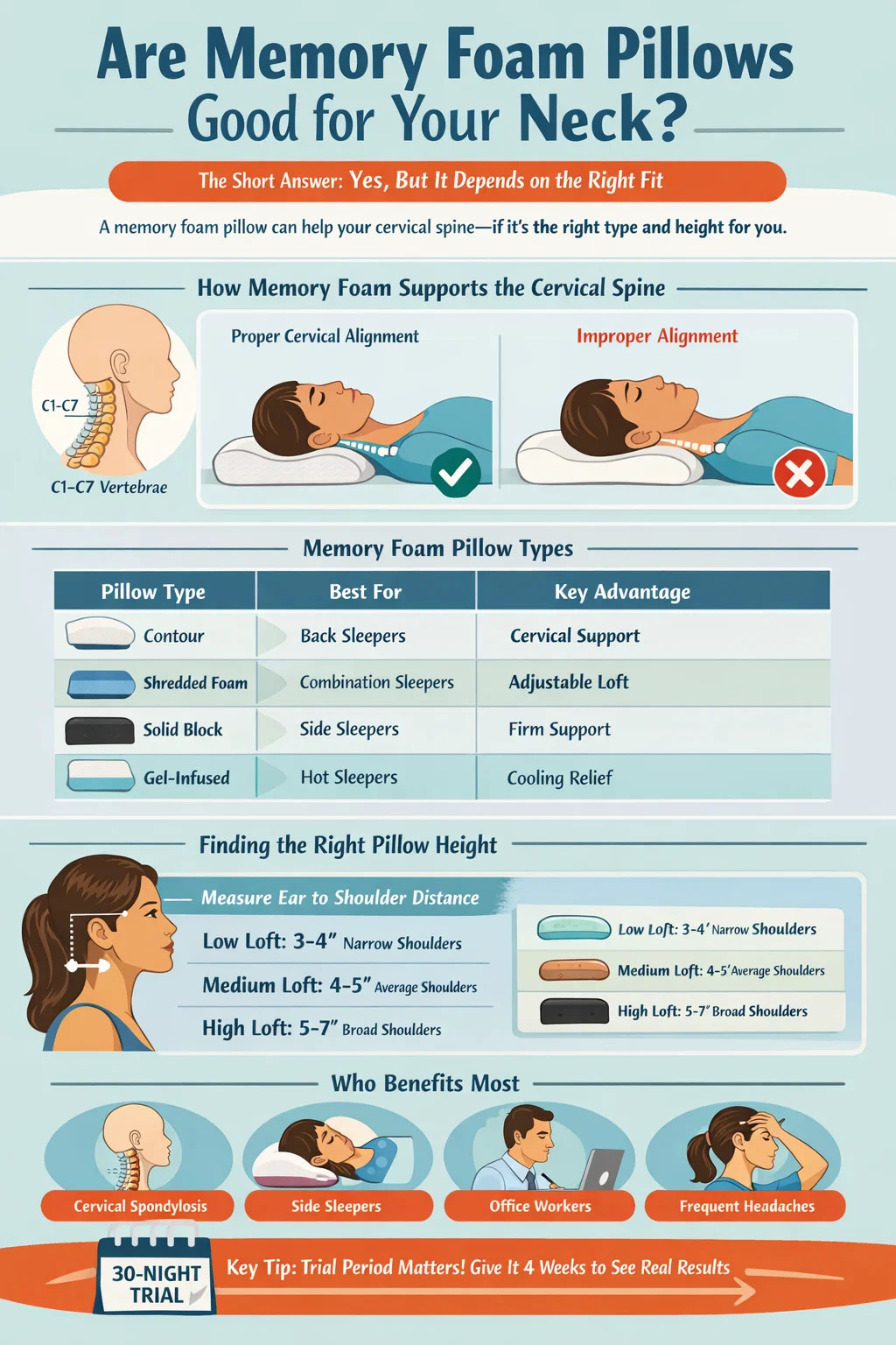 자신의 수면 자세와 어깨 너비에 맞는 메모리폼 베개를 선택하고, 4주 동안 정품 체험을 해보고, 솔직하게 결과를 평가해 보세요. 많은 사람들에게 이 단일 변화는 자궁경부 건강과 전반적인 수면의 질을 측정 가능하고 지속적으로 향상시킵니다.